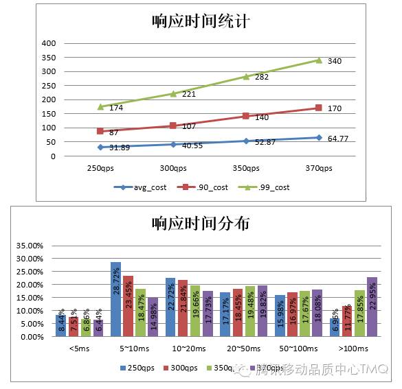 对于响应时间的统计,应从均值、.90、.99、分布等多个角度统计,而不仅仅是给出均值。下图是响应时间统计的一个例子