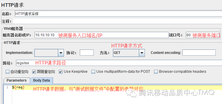 我们使用Jmeter发送测试数据来模拟用户请求,Jmeter测试配置文件使用的原件如下图所示。从图中可以看出,性能测试的配置文件主要由数据文件配置(线程间共享方式、到达末尾时的行为等)、吞吐量控制、HTTP采样器(域名、端口、HTTP METHOD、请求body等)、响应断言(对返回结果的内容进行校验)。