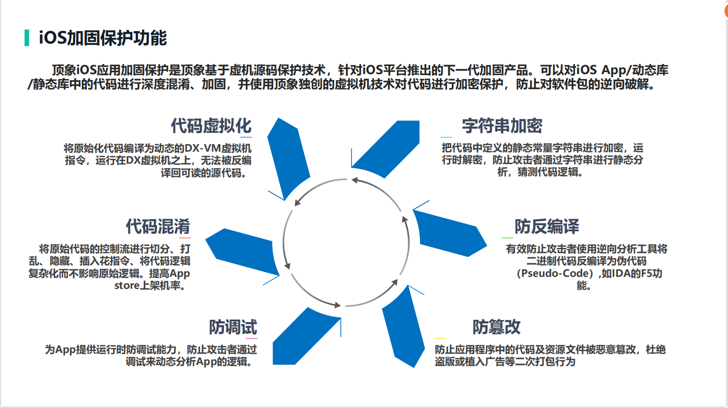顶象 iOS 加固保护是顶象基于虚机源码保护技术,针对 iOS 平台推出的下一代加固产品。可以对 iOS App 中的可执行文件进行深度混淆、加固,并使用顶象独创的虚拟机技术对代码进行加密保护,使用任何工具都无法直接进行逆向、破解。对 App 进行完整性保护,防止应用程序中的代码及资源文件被恶意篡改。