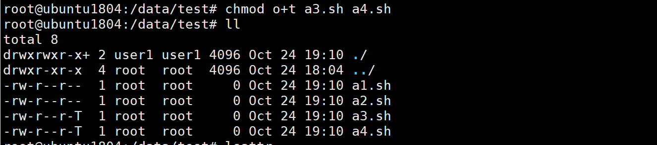 (3)、user1在/data/test目录下创建文件a1.sh, a2.sh, a3.sh, a4.sh,设置所有用户都不可删除1.sh,2.sh文件、除了user1及root之外,所有用户都不可删除a3.sh, a4.sh