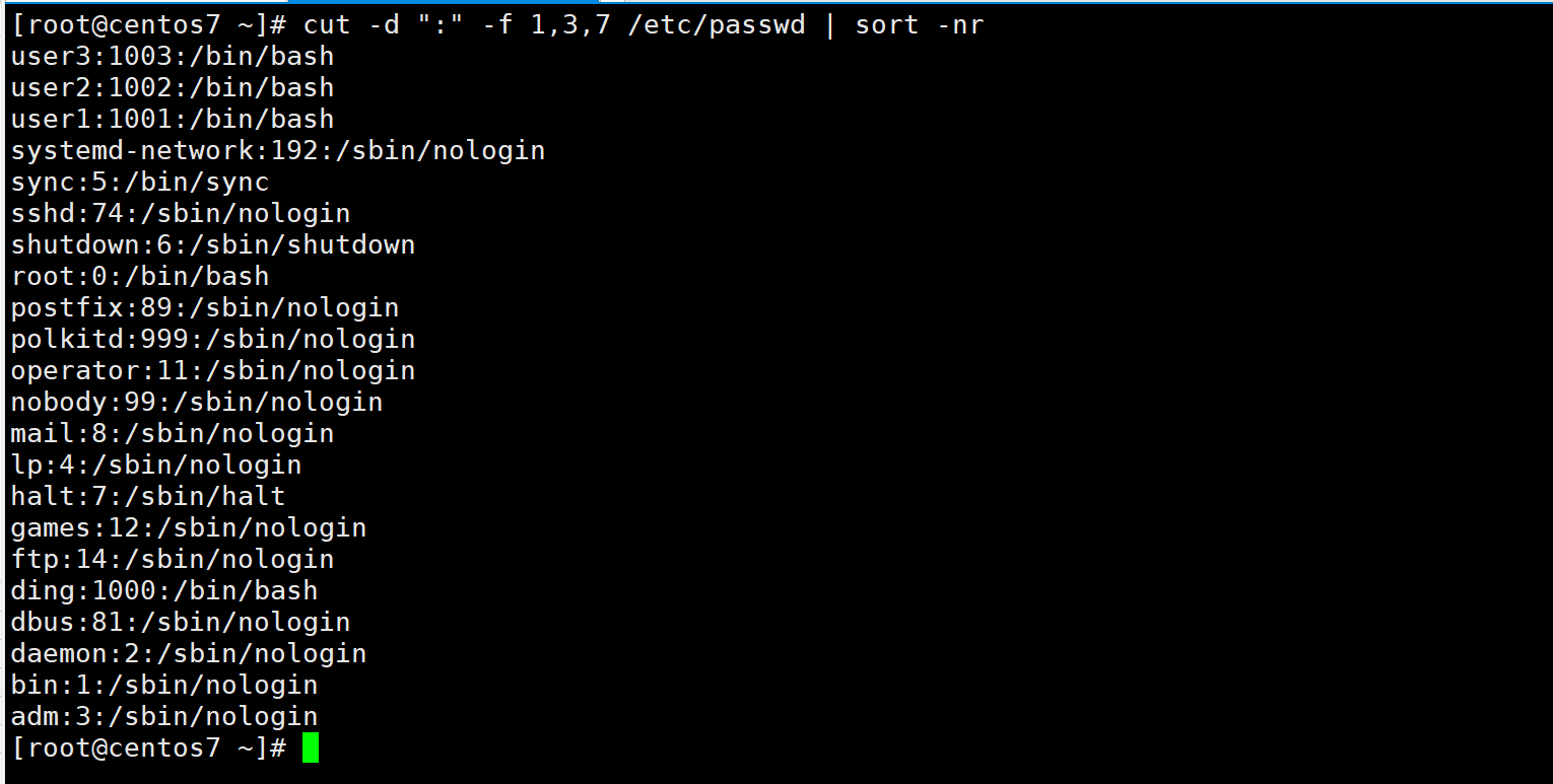 3)查出用户UID的用户名、UID及shell类型并倒序排出