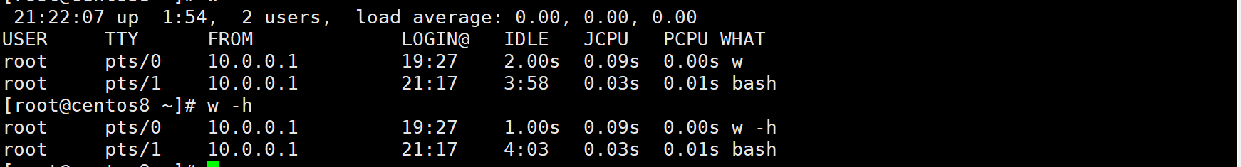 Linux w命令用于显示目前登入系统的用户信息。 ( -h 不显示各栏位的标题信息列。)