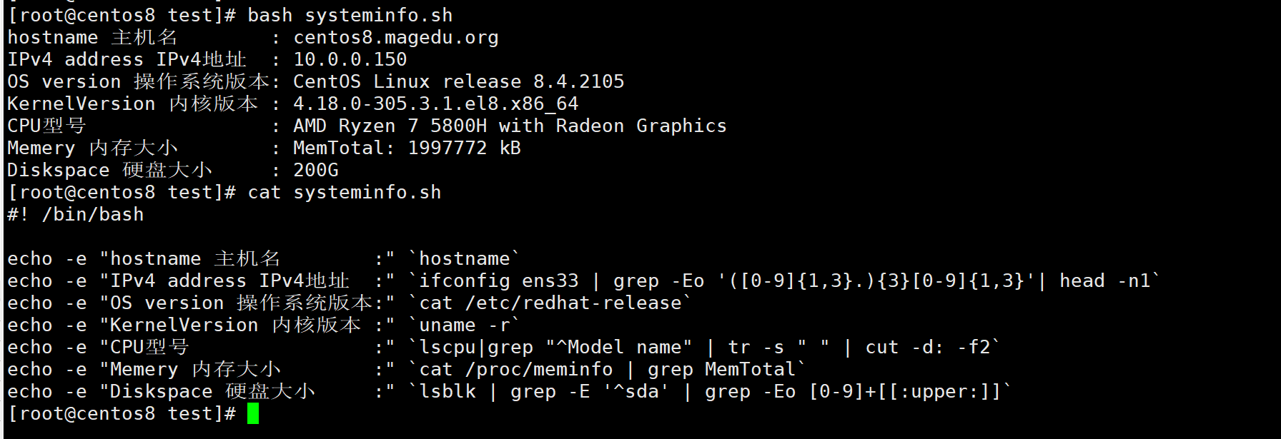 编写脚本 systeminfo.sh,显示当前主机系统信息,包括:主机名,IPv4地址,操作系统版本,内核版本,CPU型号,内存大小,硬盘大小 Linux0305
