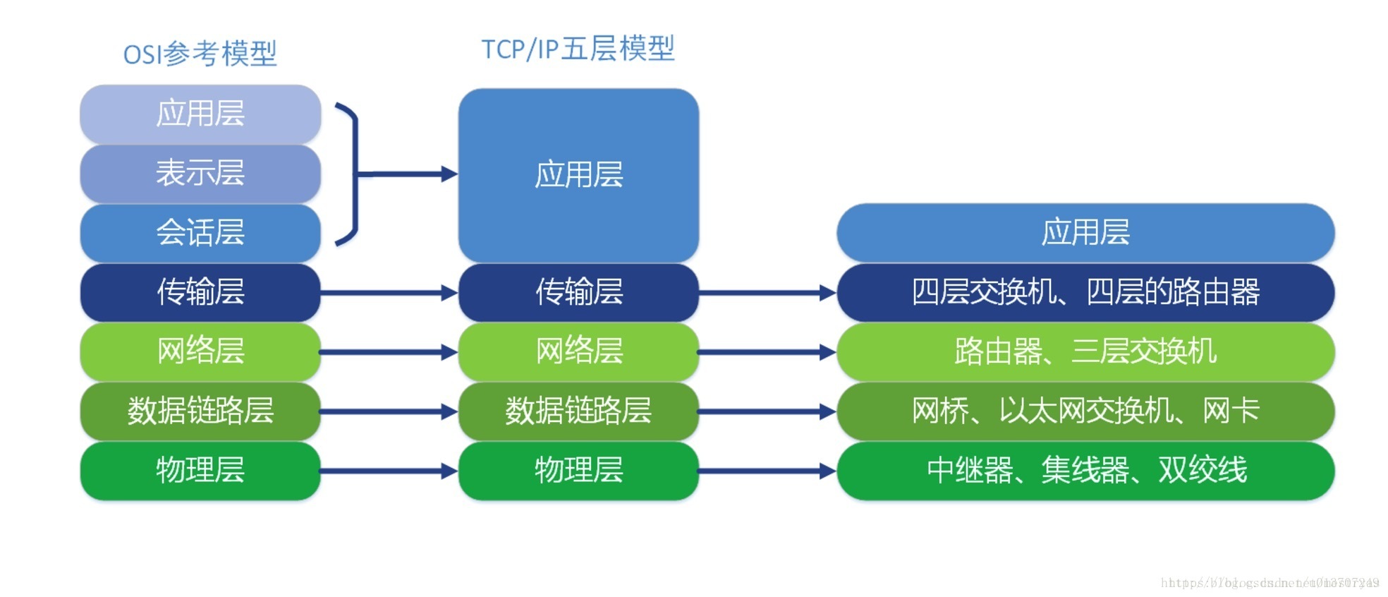 OSI七层和TCP/IP五层以及对应网络设备对比示例图
