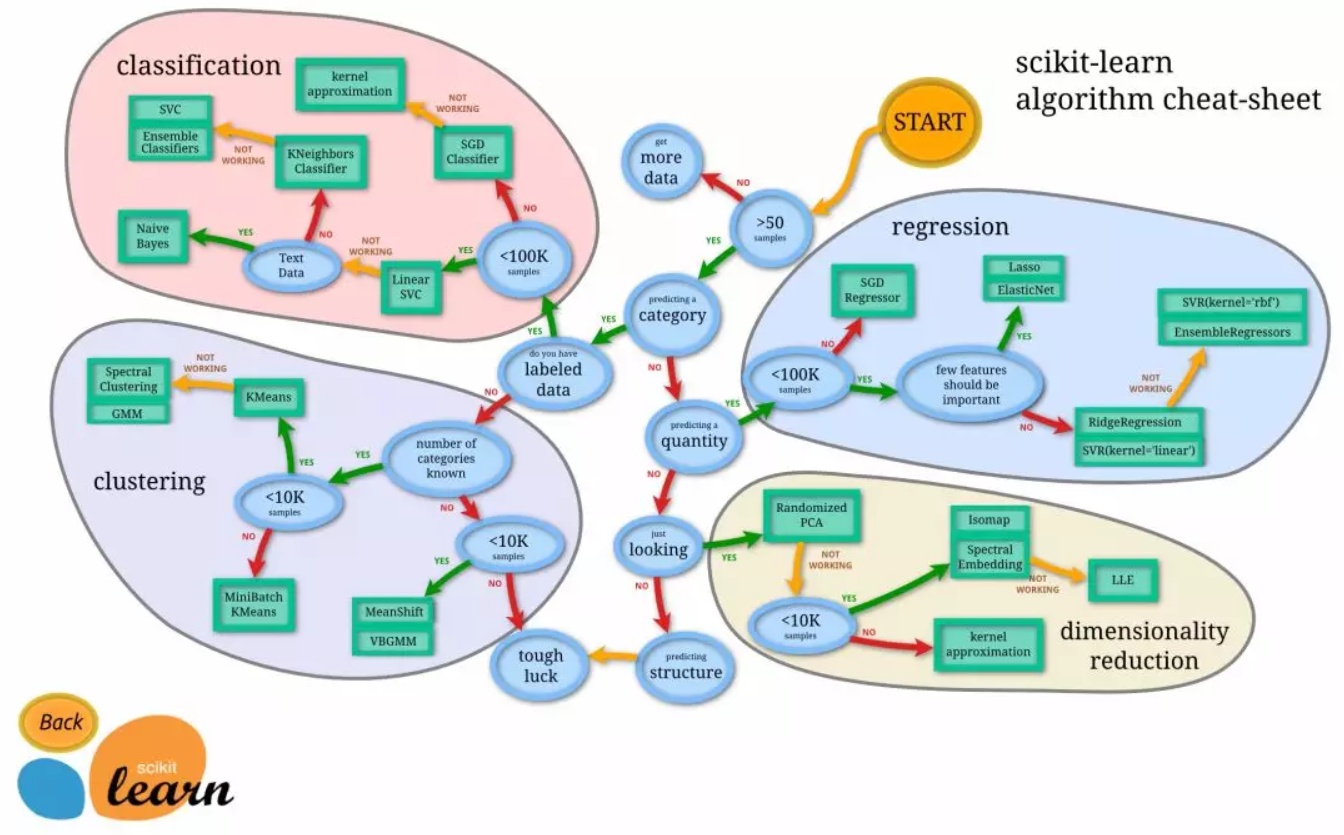 上面这幅图是是sklearn的机器学习算法笔记,你可以在学习中去建立类似的笔记,有助于建立起整个学习框架,对于不懂得,再不断从细节去学。