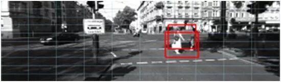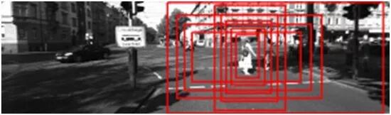 下一步是将这每一个部分都馈送给图像分类器。其输出结果就是图像的某部分有没有行人。如果有行人,就在原始图像中标记这个图像块(patch)。