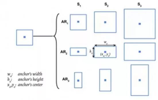 在这里,我们可以让一个锚点(anchor)对应 9 个图像块,即 3 个高度不一的方形图像块和 6 个高度不一的垂直和水平矩形图像块。这将给我们带来纵横比不一的图像块。