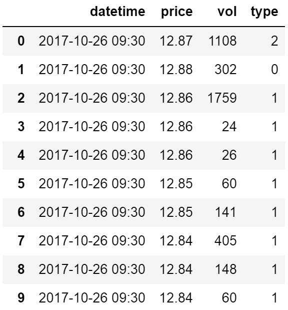 #股票tick,type:买卖方向,0-买入 1-卖出 2-集合竞价成交