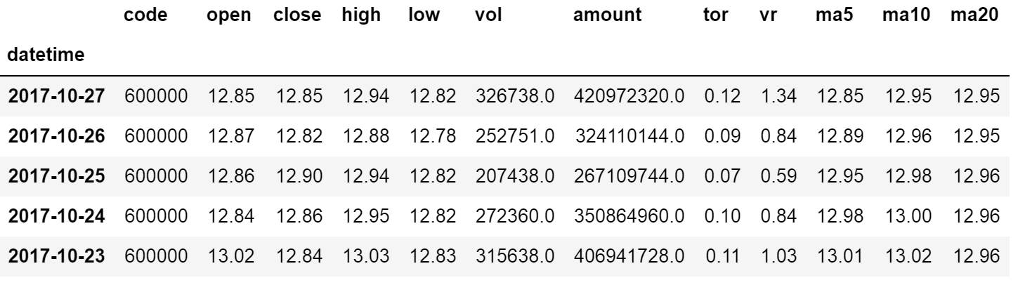 想要获得其他数据,比如价格均线、量比、换手率等数据,需要配置额外的参数。其中 ma=[5, 10, 20, 60] 表示一次性获得5/10/20/60日均线,量比和换手率数据通过factors参数配置,factors=[‘vr’, ‘tor’],vr表示量比,tor表示换手率,此次版本暂且只支持这两种因子,未来可以无限延伸。