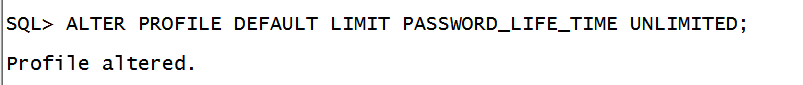 4、输入ALTER PROFILE DEFAULT LIMIT PASSWORD_LIFE_TIME UNLIMITED;修改profile密码有效期为永久。