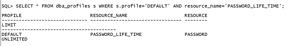 5、修改完成之后,输入,SELECT * FROM dba_profiles s WHERE s.profile='DEFAULT' AND resource_name='PASSWORD_LIFE_TIME';确认查询下。