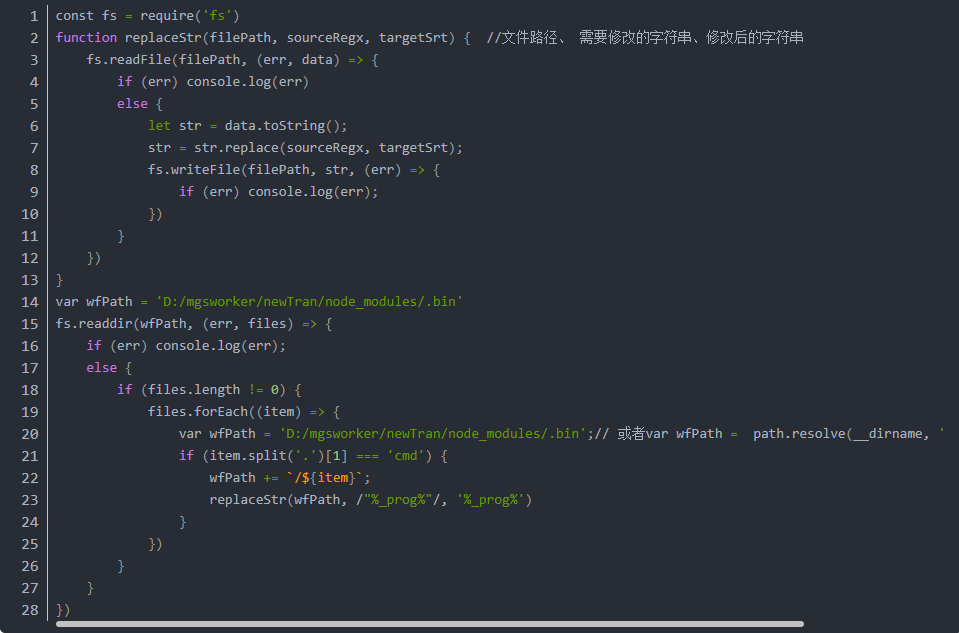const fs = require('fs') function replaceStr(filePath, sourceRegx, targetSrt) { //文件路径、 需要修改的字符串、修改后的字符串 fs.readFile(filePath, (err, data) => { if (err) console.log(err) else { let str = data.toString(); str = str.replace(sourceRegx, targetSrt); fs.writeFile(filePath, str, (err) => { if (err) console.log(err); }) } }) } var wfPath = 'D:/mgsworker/newTran/node_modules/.bin' fs.readdir(wfPath, (err, files) => { if (err) console.log(err); else { if (files.length != 0) { files.forEach((item) => { var wfPath = 'D:/mgsworker/newTran/node_modules/.bin';// 或者var wfPath = path.resolve(__dirname, '../node_modules/.bin') if (item.split('.')[1] === 'cmd') { wfPath += /${item}; replaceStr(wfPath, /"%_prog%"/, '%_prog%') } }) } } })