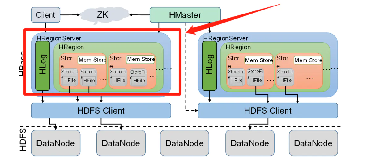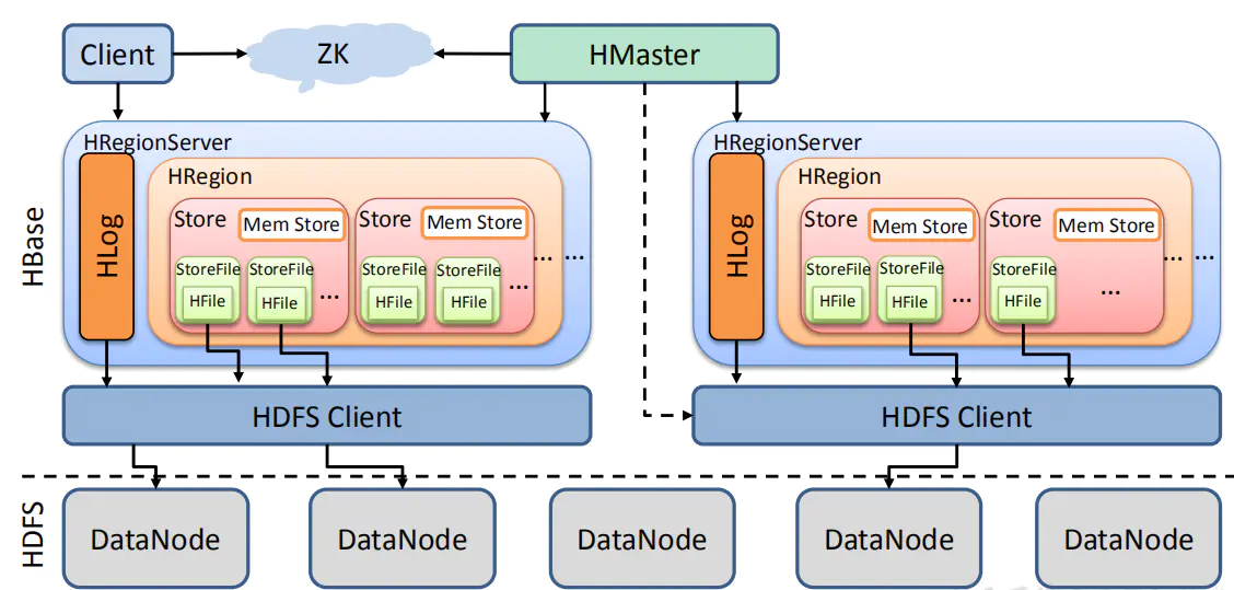 HBase通过Zookeeper来做Master的高可用、RegionServer的监控、元数据的入口以及集群配置的维护等工作。