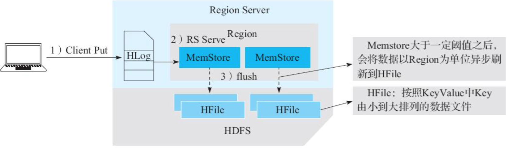 数据写入Region的流程可以抽象为两步:追加写入HLog,随机写入MemStore