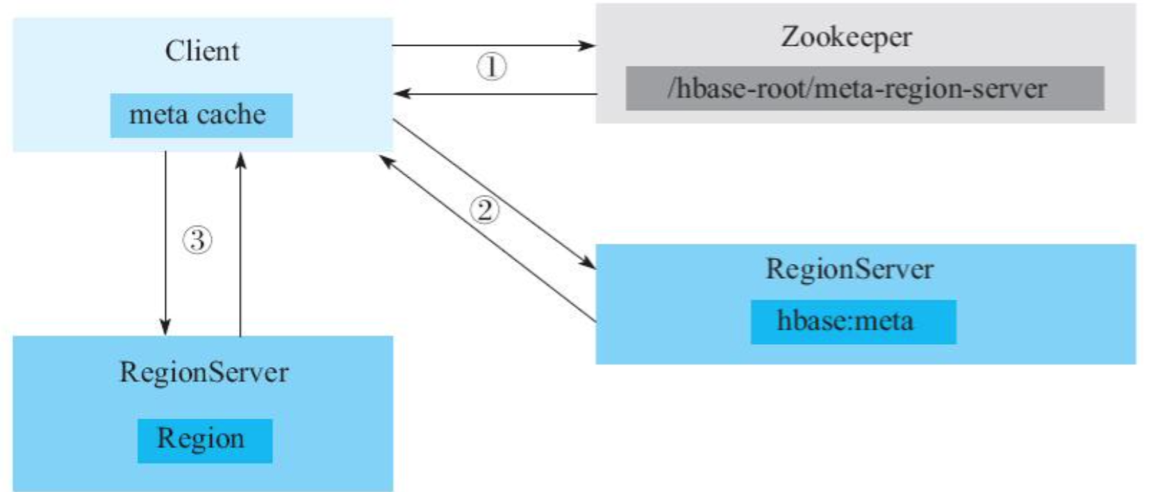 Client首先会从ZooKeeper中获取元数据hbase:meta表所在的RegionServer,然后根据待读写rowkey发送请求到元数据所在RegionServer,获取数据所在的目标RegionServer和Region(并将这部分元数据信息缓存到本地),最后将请求进行封装发送到目标RegionServer进行处理。