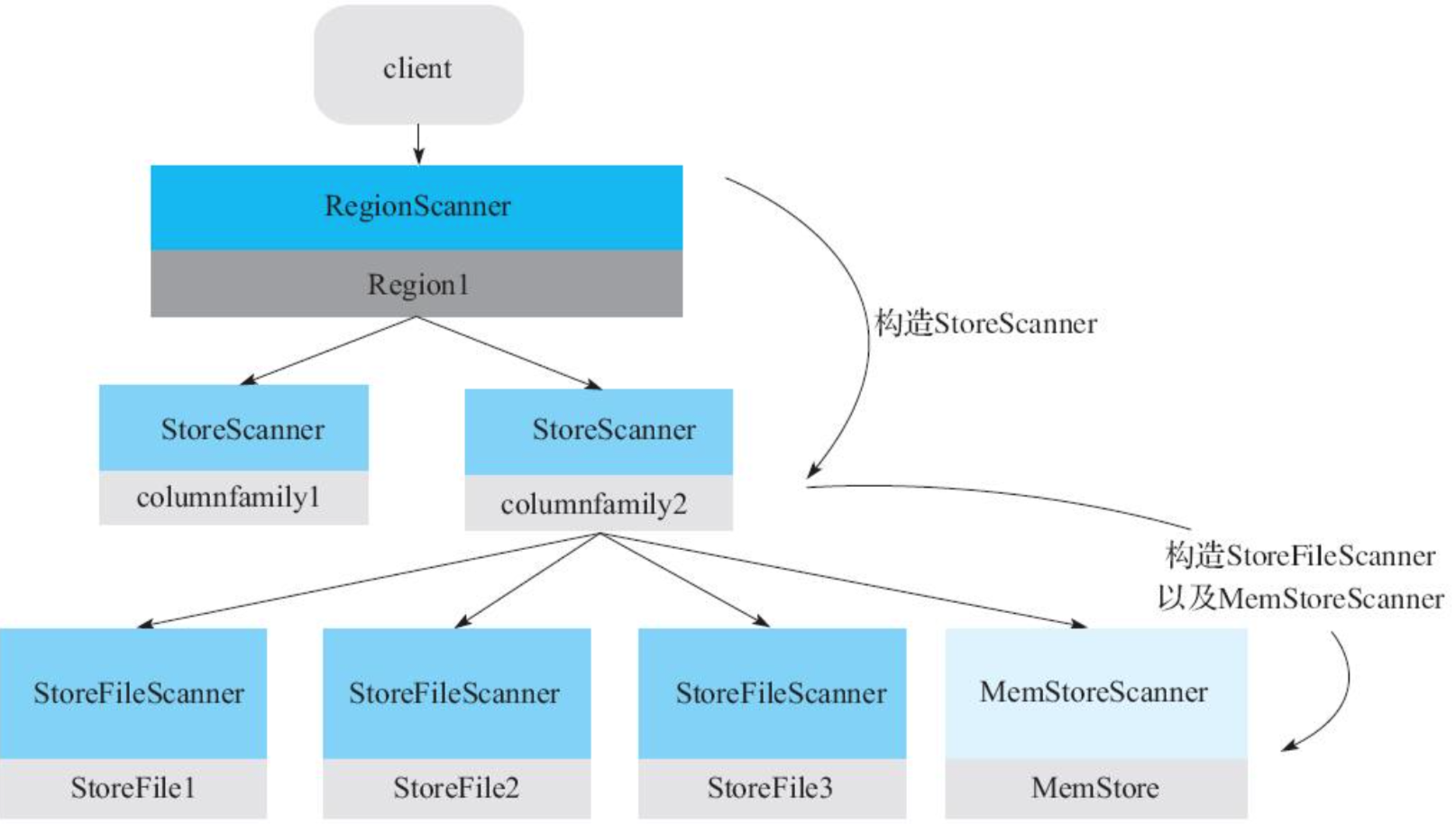 Scanner的核心体系包括三层Scanner:RegionScanner,StoreScanner,MemStoreScanner和StoreFileScanner。