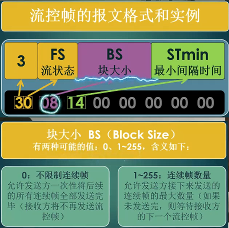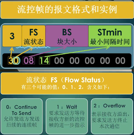 流控帧的3个控制字节:第一个字节的高4位为3代表为流控帧,低4位代表流状态(FS)。