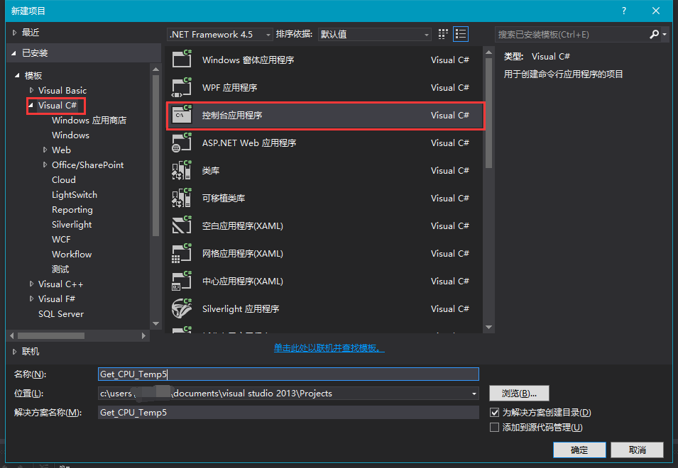 以管理员权限启动 VS2013 > 新建项目 > 左侧选择Visual C#,右侧选择 控制台应用程序(Console Application)> 确定