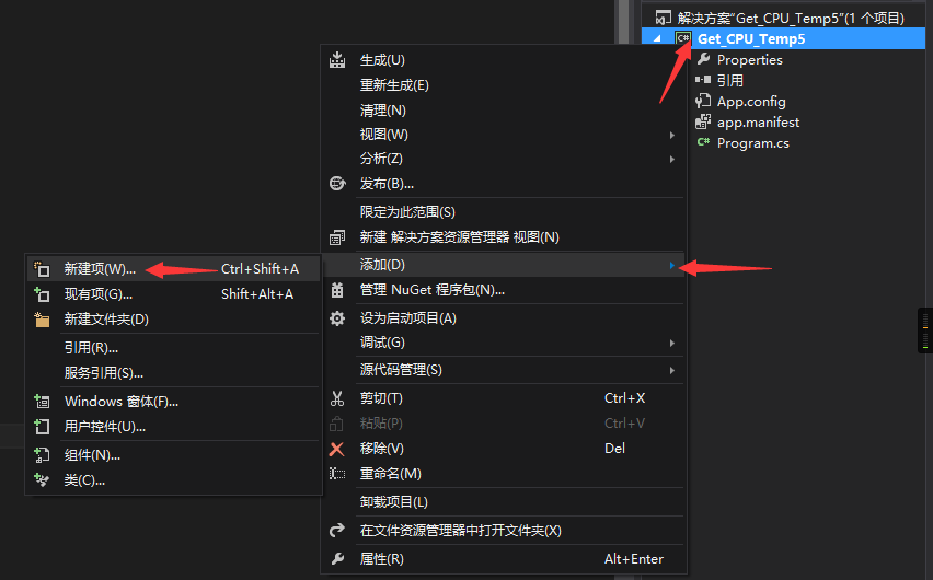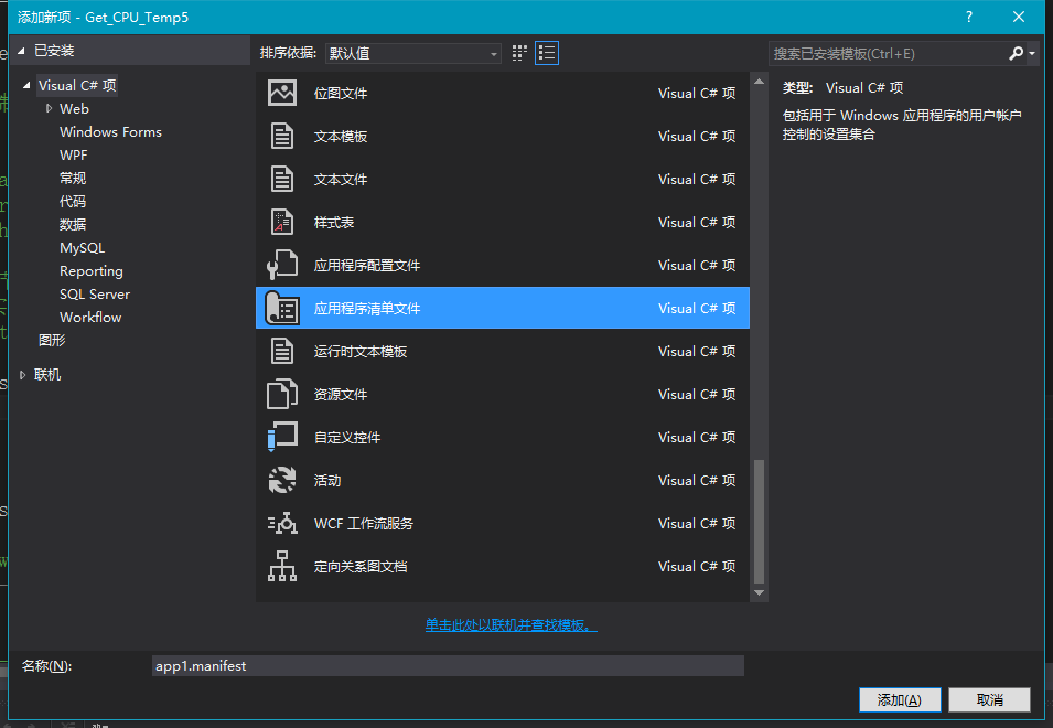 右键 > 添加 > 新建项,选中“应用程序清单文件”,确定。(生成app.manifest文件,如果文件已存在可忽略)