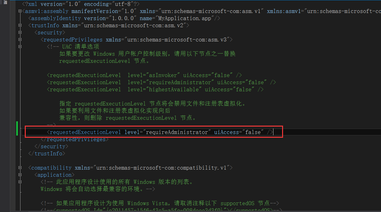 修改为 <requestedExecutionLevel level="requireAdministrator" uiAccess="false" />