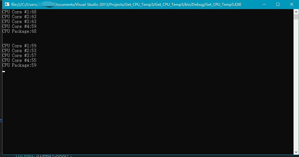 1 using System; 2 using System.Collections.Generic; 3 using System.Linq; 4 using System.Text; 5 using System.Threading.Tasks; 6 using OpenHardwareMonitor.Hardware; 7 using System.Threading; 8 namespace Get_CPU_Temp5 9 { 10 class Program 11 { 12 public class UpdateVisitor : IVisitor 13 { 14 public void VisitComputer(IComputer computer) 15 { 16 computer.Traverse(this); 17 } 18 public void VisitHardware(IHardware hardware) 19 { 20 hardware.Update(); 21 foreach (IHardware subHardware in hardware.SubHardware) subHardware.Accept(this); 22 } 23 public void VisitSensor(ISensor sensor) { } 24 public void VisitParameter(IParameter parameter) { } 25 } 26 static void GetSystemInfo() 27 { 28 UpdateVisitor updateVisitor = new UpdateVisitor(); 29 Computer computer = new Computer(); 30 computer.Open(); 31 computer.CPUEnabled = true; 32 computer.Accept(updateVisitor); 33 for (int i = 0; i < computer.Hardware.Length; i++) 34 { 35 if (computer.Hardware[i].HardwareType == HardwareType.CPU) 36 { 37 for (int j = 0; j < computer.Hardware[i].Sensors.Length; j++) 38 { 39 if (computer.Hardware[i].Sensors[j].SensorType == SensorType.Temperature) 40 Console.WriteLine(computer.Hardware[i].Sensors[j].Name + ":" + computer.Hardware[i].Sensors[j].Value.ToString() + "\r"); 41 } 42 } 43 } 44 computer.Close(); 45 } 46 static void Main(string[] args) 47 { 48 while (true) 49 { 50 GetSystemInfo(); 51 Thread.Sleep(5000); 52 Console.WriteLine(); 53 Console.WriteLine(); 54 } 55 } 56 } 57 }