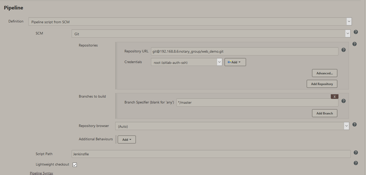 - project ==> git ==> Repository ==> Remotes ==> Add gitlab http://192.168.8.6:888/notary_group/web_demo.git