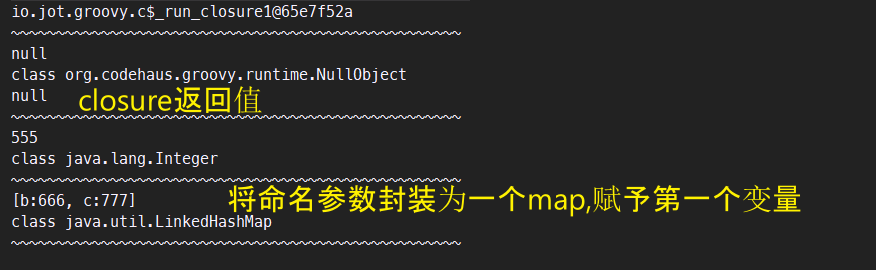 static def b(Closure closure) { println(closure) println '~' * 50 println(closure()) println '~' * 50 closure 555 println '~' * 50 closure b: 666, c: 777 println '~' * 50 } b { b -> println b; println(b.getClass()) }