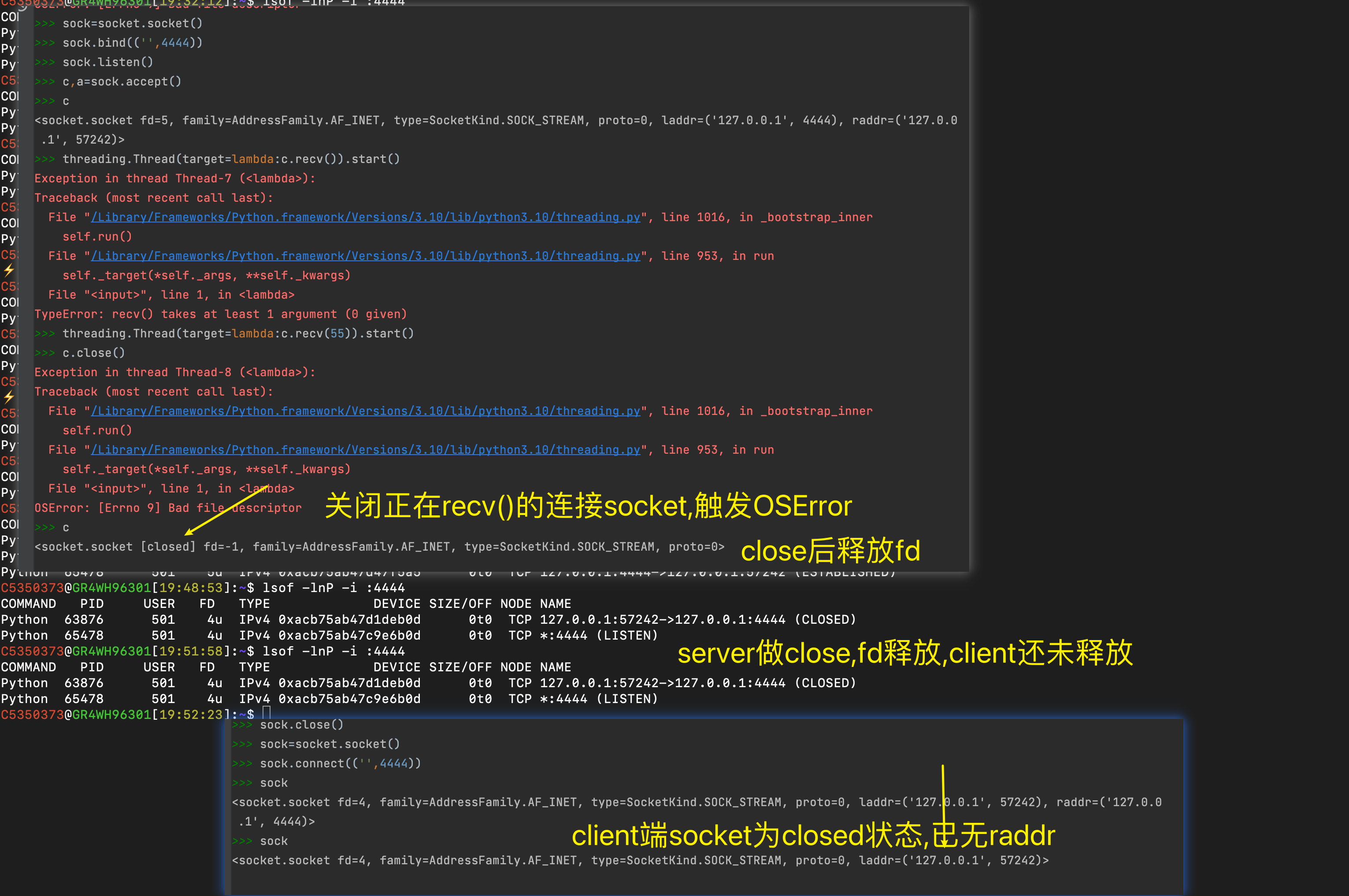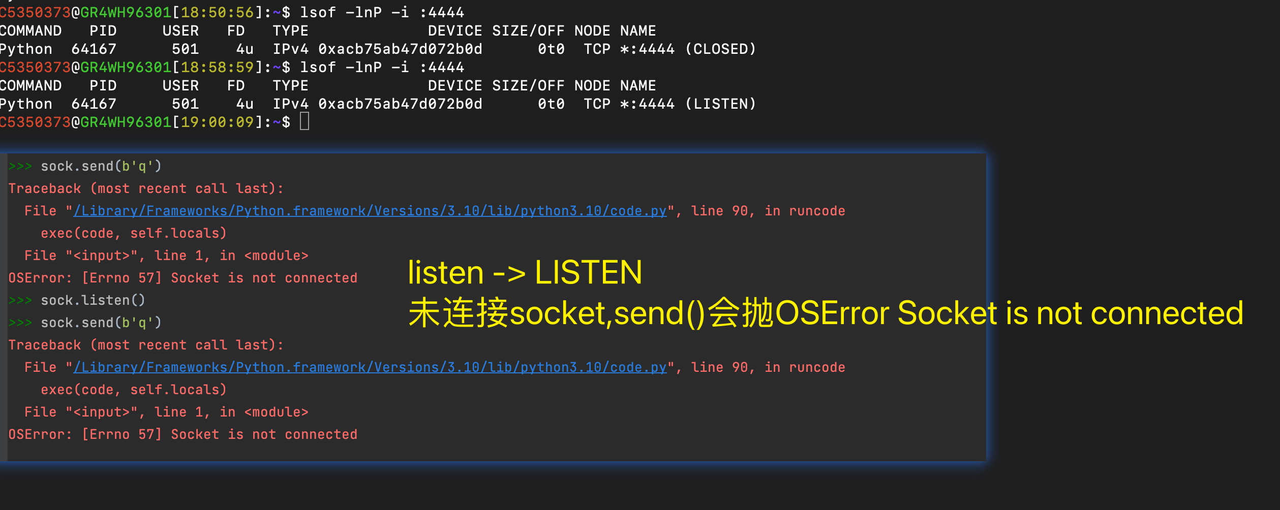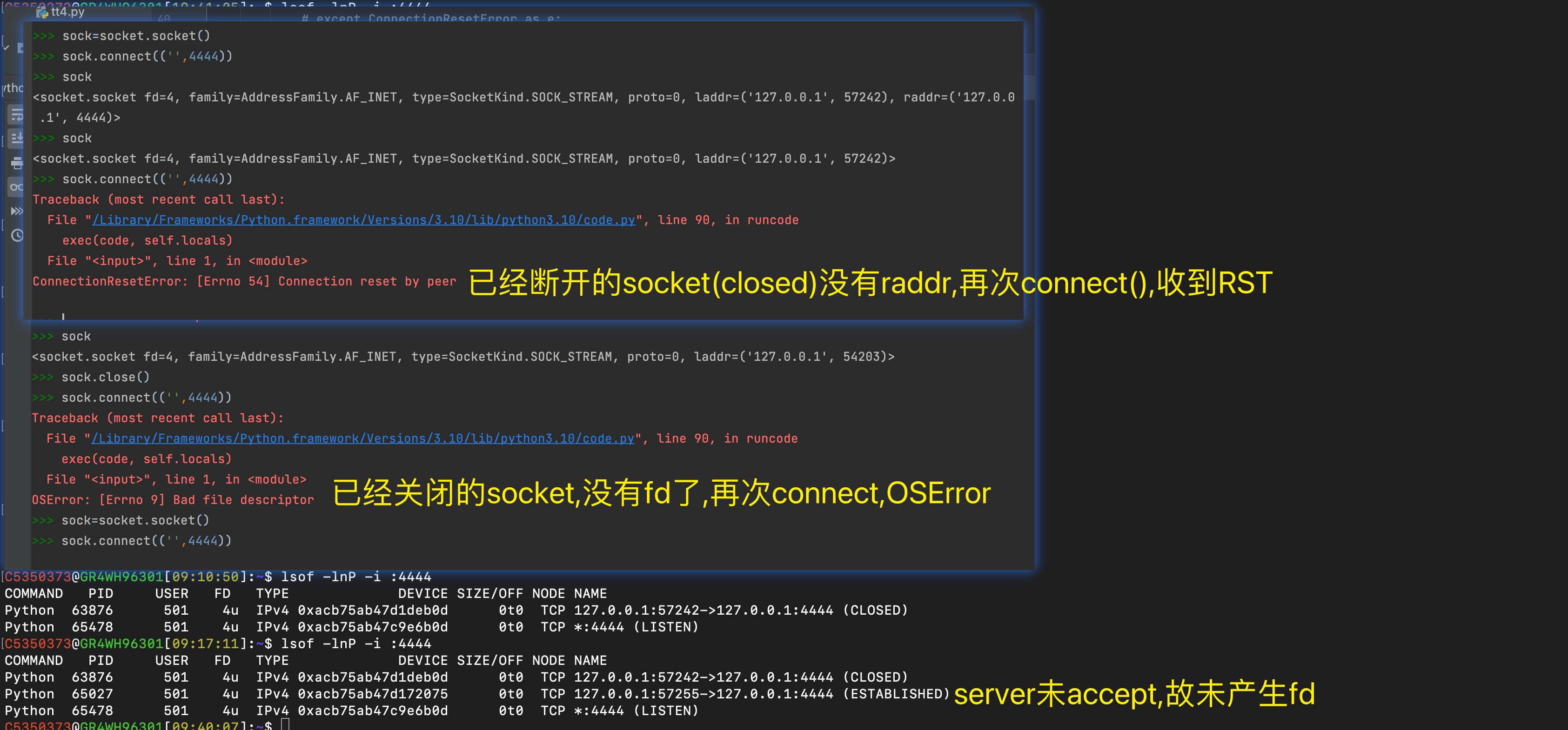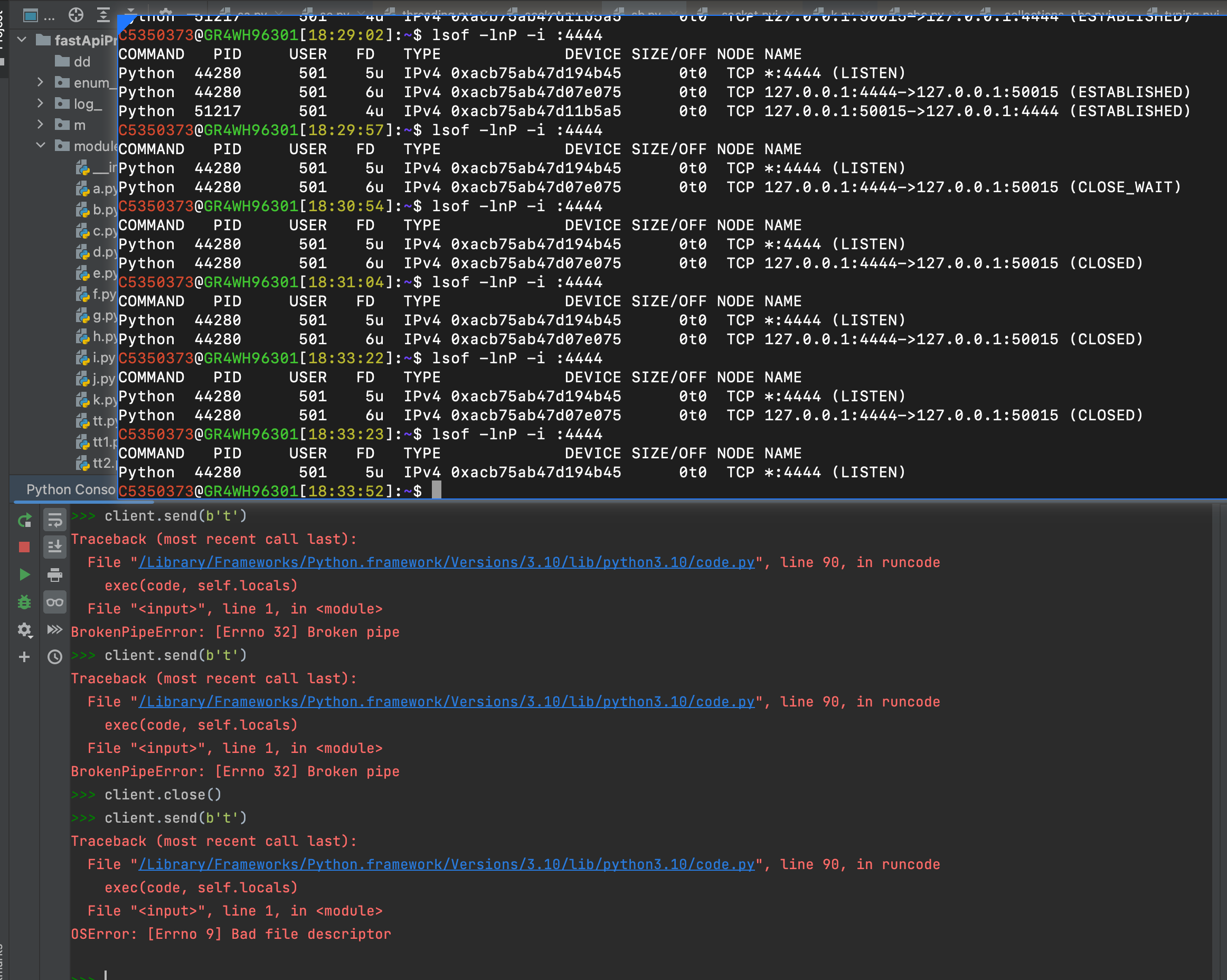 向处于CLOSE_WAIT的socket发送数据是OK的, 向CLOSED状态的socket发数据触发,BrokenPipeError, 此时fd没有被释放,client此socket没有close, 调用close后, lsof显示连接被释放, 在调用send时, 报OSError