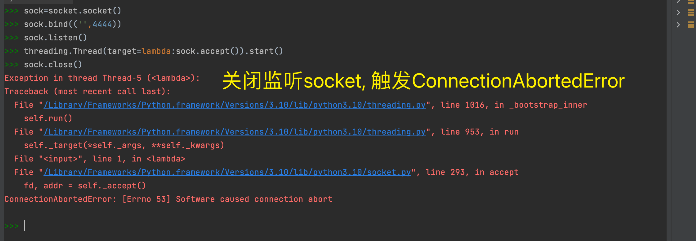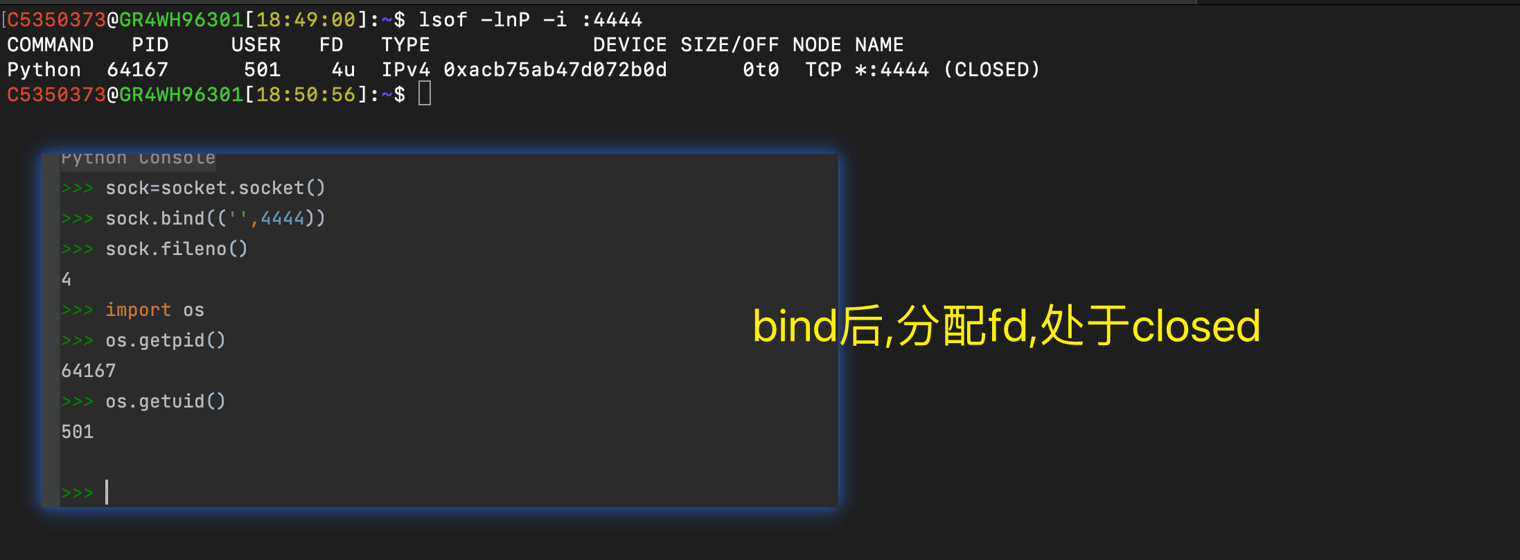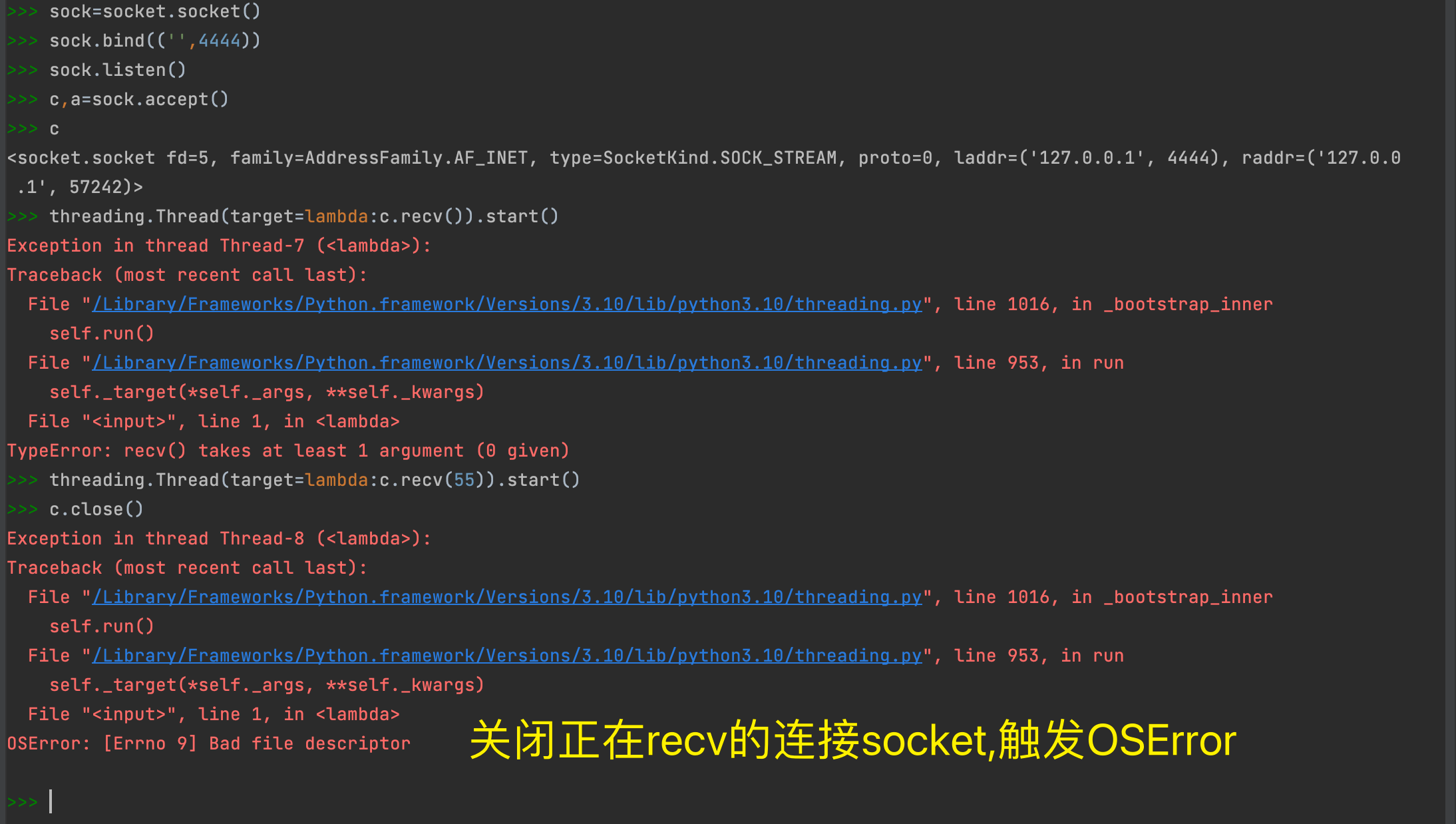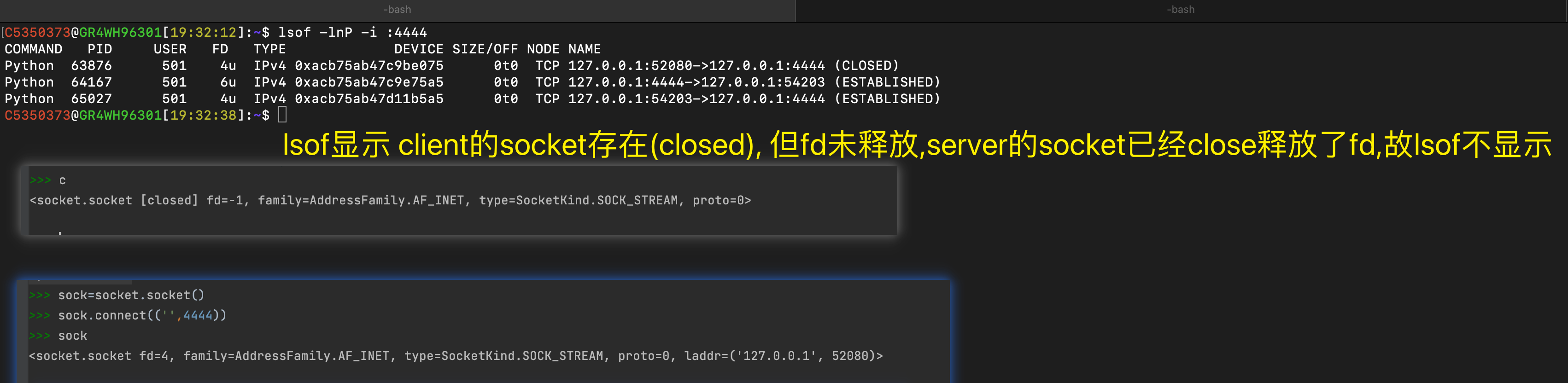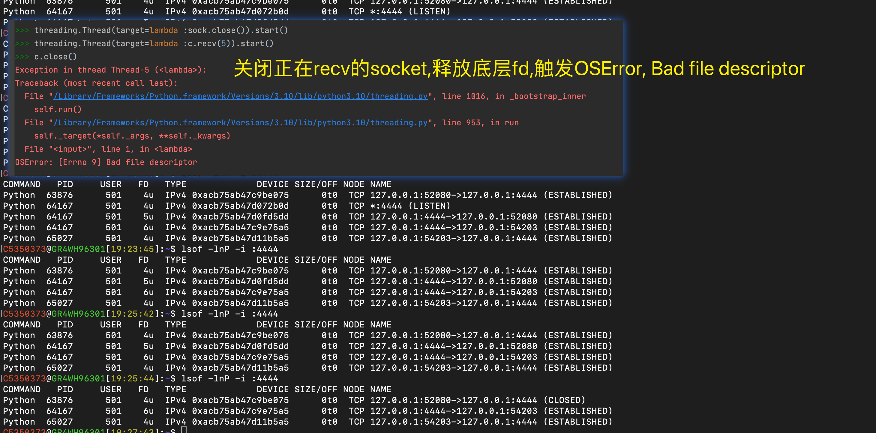 向处于CLOSE_WAIT的socket发送数据是OK的, 向CLOSED状态的socket发数据触发,BrokenPipeError, 此时fd没有被释放,client此socket没有close, 调用close后, lsof显示连接被释放, 在调用send时, 报OSError