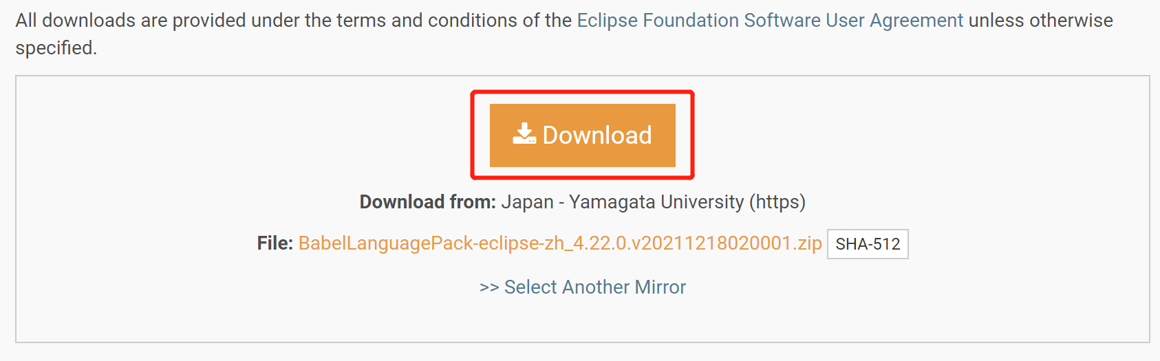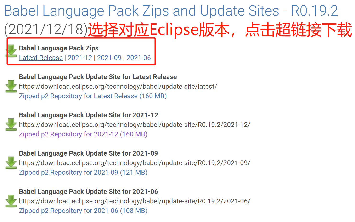 (1)下载地址:https://www.eclipse.org/babel/downloads.php,在下载页面的Babel Language Pack Zips选项下选择对应的Eclipse版本的超链接下载语言包