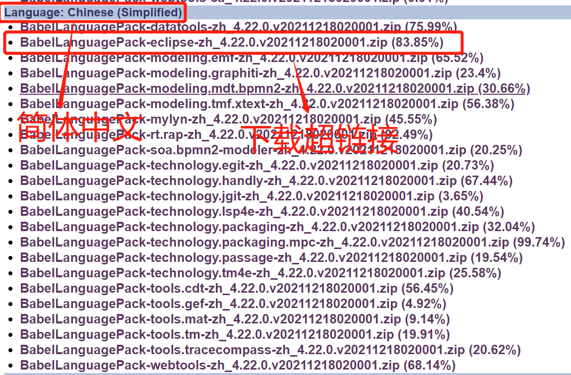 (2)在弹出的下载列表页面中,在Language: Chinese (Simplified)列表下选择并单击 BabelLanguagePack-eclipse-zh_XXX的超链接