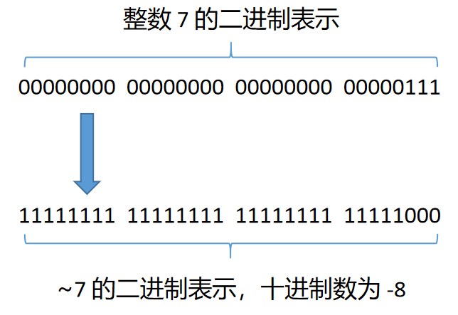 左边最高位是符号位,最高位是 0 表示正数,若为 1 则表示负数。负数采用补码表示。如 -8 的二进制表示为 :