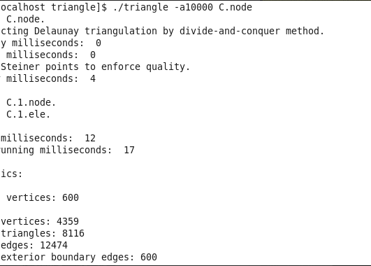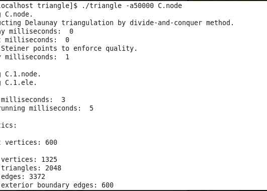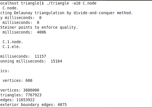 Imposes a maximum triangle area constraint. A fixed area constraint (that applies to every triangle) may be specified after the `a', or varying area constraints may be read from a .poly file or .area file.