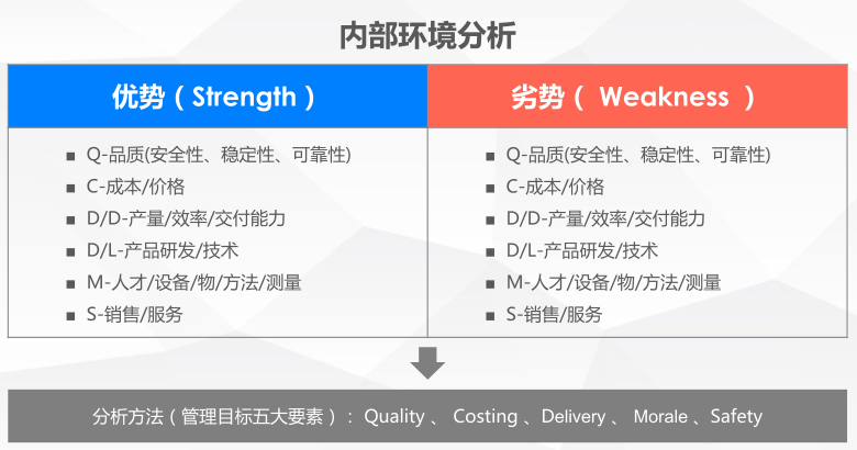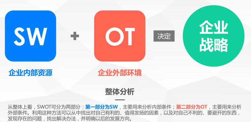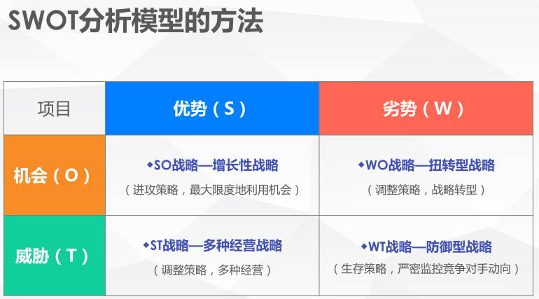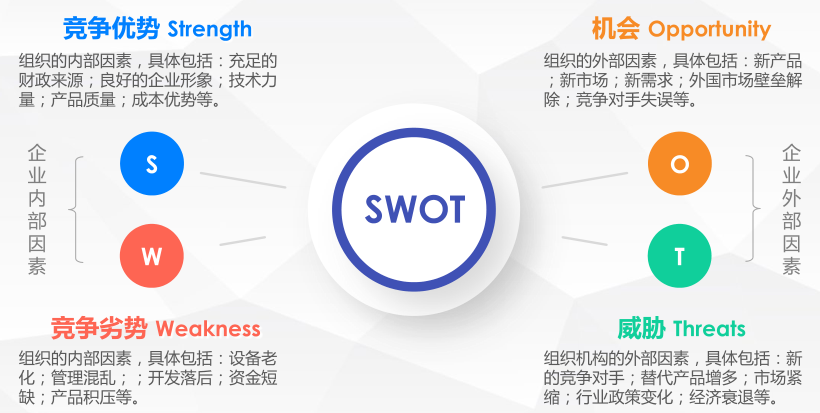 SWOT分析法又称态势分析法,是把组织内外环境所形成的机会(Opportunities),风险(Threats),优势(Strengths),劣势(Weaknesses)四个方面的情况,结合起来进行分析,以寻找制定适合组织实际情况的经营战略和策略的方法。