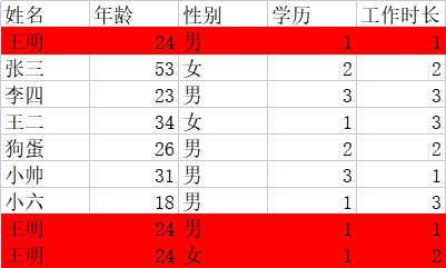 情况一:筛选列如果选择全部列,就是所有列的数据重复,才会认为数据是重复值,进行删除