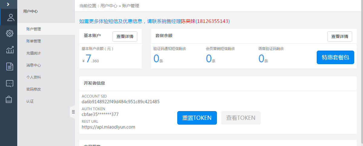 2.在帐号管理中,获得开发者信息中的TOKEN 和SID