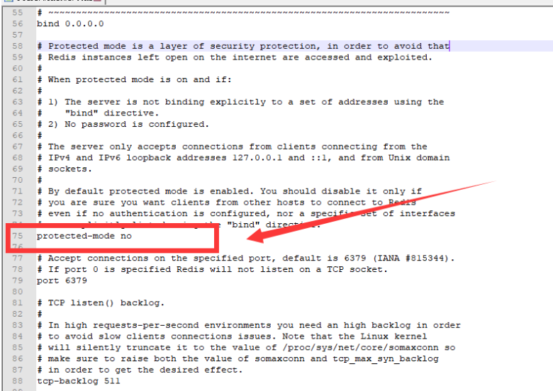 2、将redis默认的守护关闭,即:将 protected-mode yes 修改为 protected-mode no,如下图所示: