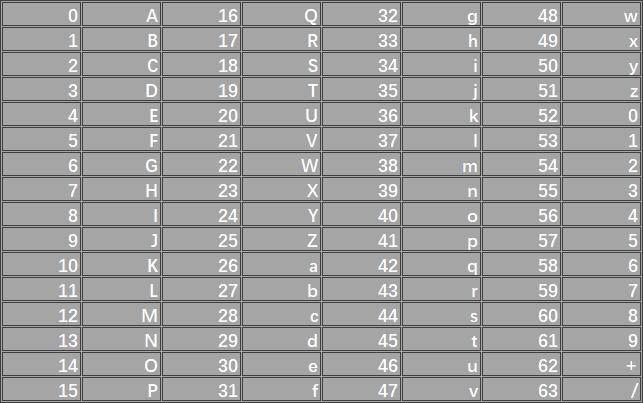 把每3个8位二进制数(3*8=24)转化为4个6位二进制数(4*6=24),不足6位的补0。之后分别把每个6位二进制数转化为十进制数,根据编码表找出十进制数对应的字符。