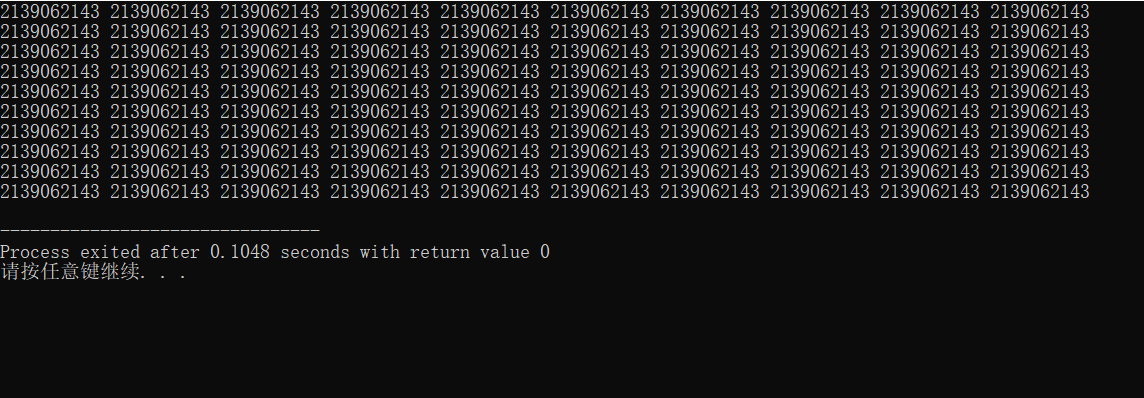#include<iostream> #include<cstring> using namespace std; int main(){ int a[10][10];//声明一个10*10的二维数组,仅做储存数据使用,无数学意义 memset(a,127,sizeof(a));//将数组中的所有元素全赋值为2139062143 for(int i=0;i<10;i++){ for(int j=0;j<10;j++){ cout<<a[i][j]<<' '; } cout<<endl; }//for循环输出 return 0; }