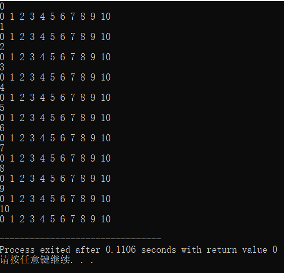 #include<iostream> #include<cstring> using namespace std; int main(){ for(int i=0;i<=10;i++){ cout<<i<<endl; for(int j=0;j<=10;j++){ cout<<j<<' '; } cout<<endl; } return 0; }