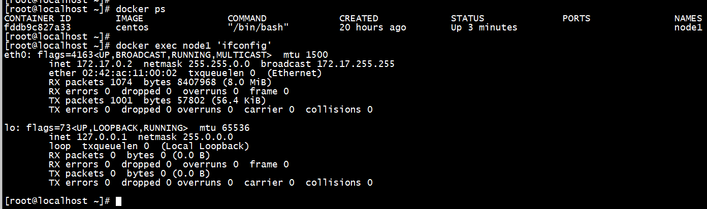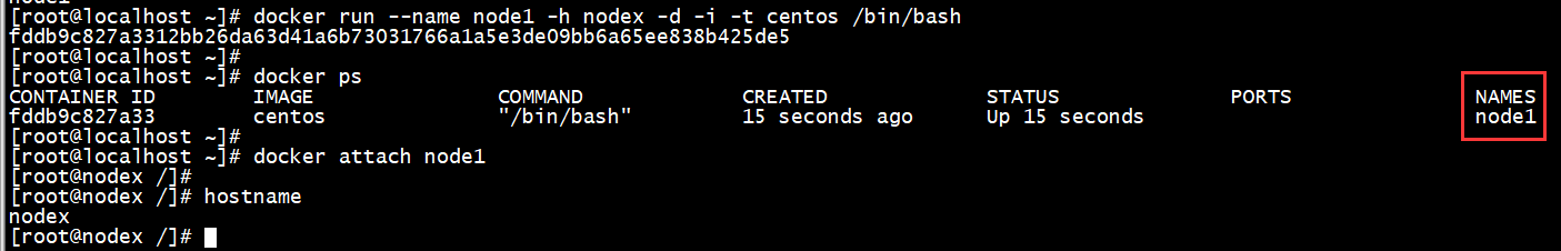 # docker run --name node1 -h nodex -d -i -t centos /bin/bash