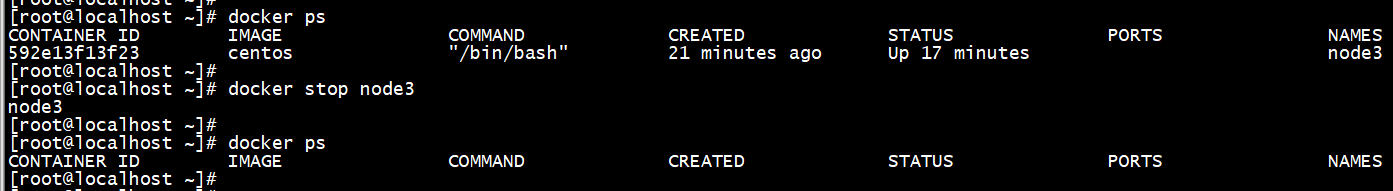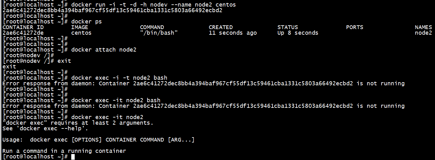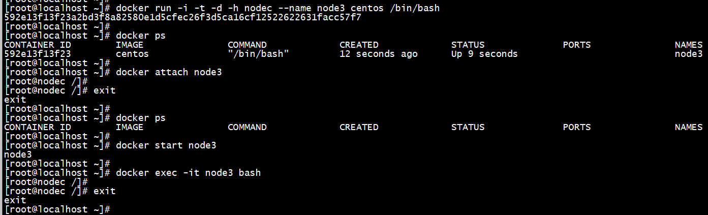 # docker run -i -t -d -h nodec --name node3 centos /bin/bash