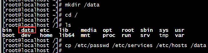 # cp /etc/passwd /etc/services /etc/hosts /data