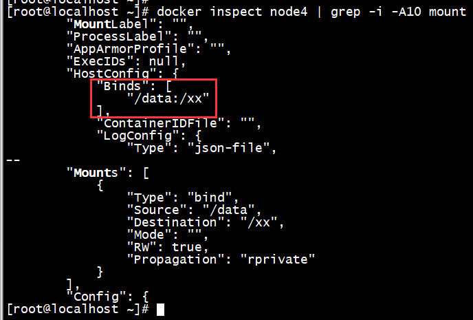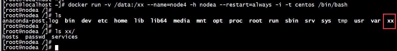 # docker run -v /data:/xx --name=node4 -h nodea --restart=always -i -t centos /bin/bash