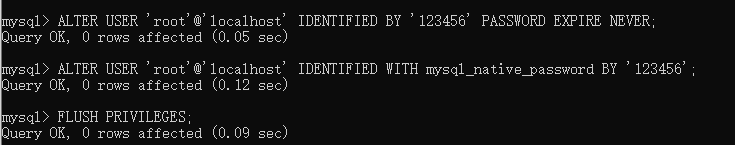 # 修改加密规则 (1)ALTER USER 'root'@'localhost' IDENTIFIED BY '123456' PASSWORD EXPIRE NEVER; # 更新一下用户的密码 (2)ALTER USER 'root'@'localhost' IDENTIFIED WITH mysql_native_password BY '123456'; # 刷新权限 (3)FLUSH PRIVILEGES;