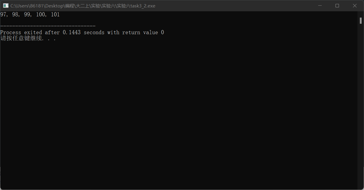 1 #include <iostream> 2 #include <fstream> 3 #include <array> 4 #define N 5 5 6 int main() { 7 using namespace std; 8 9 array<int, N> x; 10 11 ifstream in; 12 in.open("data1.dat", ios::binary); 13 if(!in.is_open()) { 14 cout << "fail to open data1.dat\n"; 15 return 1; 16 } 17 18 //从文件流对象in关联的文件data1.dat中读取sizeof(x)字节数据写入&x开始的地址单元 19 in.read(reinterpret_cast<char *>(&x), sizeof(x)); 20 in.close(); 21 22 for(auto i = 0; i < N; ++i) 23 cout << x[i] << ", "; 24 cout << "\b\b \n"; 25 }