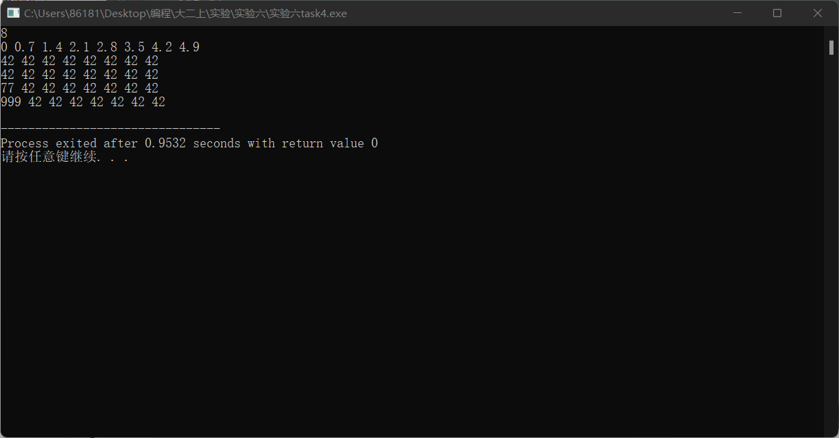 1 #include <iostream> 2 #include "实验六task4_vector.hpp" 3 4 void test() { 5 using namespace std; 6 7 int n; 8 cin >> n; 9 10 Vector<double> x1(n); 11 for(auto i = 0; i < n; ++i) 12 x1.at(i) = i * 0.7; 13 14 output(x1); 15 16 Vector<int> x2(n, 42); 17 Vector<int> x3(x2); 18 19 output(x2); 20 output(x3); 21 22 x2.at(0) = 77; 23 output(x2); 24 25 x3[0] = 999; 26 output(x3); 27 } 28 29 int main() { 30 test(); 31 }