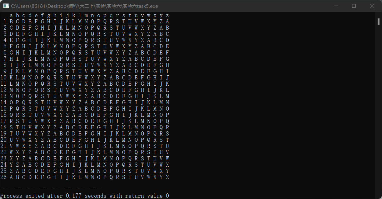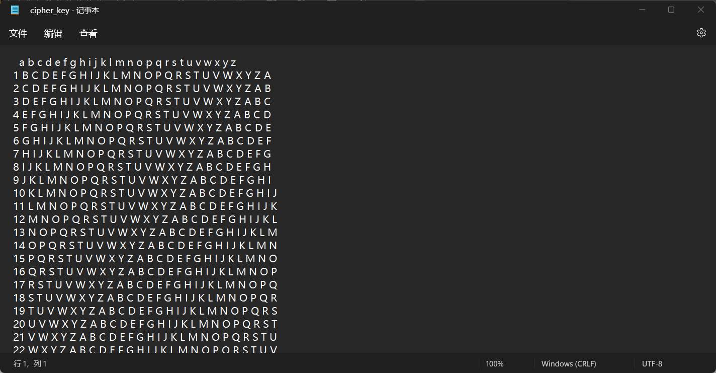 1 #include <iostream> 2 #include <fstream> 3 #include <iomanip> 4 #include <vector> 5 6 using namespace std; 7 8 void put(std::ostream &out, int n, char a) { 9 char A = 'A'; 10 int i = 0; 11 cout << n; 12 out << n; 13 for(;a <= 'Z'; a++) 14 { 15 cout << setw(2) << a; 16 out << setw(2) << a; 17 i++; 18 } 19 for(;i < 26; i++, A++) 20 { 21 cout << setw(2) << A; 22 out << setw(2) << A; 23 } 24 } 25 26 void output(std::ostream &out) { 27 char k = 'a', K = 'B'; 28 cout << " "; 29 out << " "; 30 for(;k <= 'z'; k++) 31 { 32 cout << setw(2) << k; 33 out << setw(2) << k; 34 } 35 cout << endl; 36 out << endl; 37 for(int i = 1; i <= 26; i++, K++) { 38 if(i < 10) 39 cout << " "; 40 out << " "; 41 put(out,i,K); 42 cout << endl; 43 out << endl; 44 } 45 46 } 47 48 int main() { 49 ofstream out; 50 51 out.open("cipher_key.txt", ios::out); 52 if(!out.is_open()) { 53 cout << "fail to open chipher_key\n"; 54 return 1; 55 } 56 output(out); 57 out.close(); 58 }