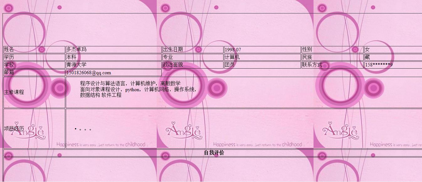 <!DOCTYPE html> <html> <head> <meta charset="UTF-8"> <title>多杰卓玛</title> <embed src="明天你好.mp3" hidden="true" autostart="true" loop="true"> <style> body { background-image:url(img/01.jpg) } </style> </head> <body> <table width="1350"height="400" border="1"style=" > <table width="1300" height="800" border="1" style=" background:url(img/01.jpg)"" align="center"> <tr height= 100 bgcolor=black> <tr> <td width="90">姓名 </td> <td width="100">多杰卓玛</td> <td width="89">出生日期 </td> <td width="113">1998.07</td> <td width="91">性别</td> <td width="48">女</td> </tr> <tr> <td> 学历</td> <td>本科</td> <td>专业</td> <td>计算机</td> <td>民族</td> <td>藏</td> </tr> <tr> <td>学校</td> <td>青海大学</td> <td>政治面貌</td> <td>团员</td> <td>联系方式</td> <td>158*******9</td> </tr> <tr> <td>邮箱</td> <td>1501826068@qq.com</td> </tr> <tr height="100"> <td>主修课程</td> <td colspan="6"> 程序设计与算法语言,计算机维护,离散数学 <br/> 面向对象课程设计,python,计算机网络,操作系统, <br/> 数据结构 软件工程<br/> </td> </tr> <tr> <td>项目经历</td> <td colspan="6"> <ul> <li>。。。</li> </ul> </tr> <tr> <td colspan="7" align="center"><b>自我评价</b></td> </tr> <tr> <td colspan="7" height="200"> 我在大学期间,踏实学习本专业知识,和小组合作时,负责踏实 具有强烈的团队合作精神和工作能力。 </td> </tr> <tr> <td colspan="7" align="center"><b>兴趣爱好</b></td> </tr> <tr> <td colspan="500" height="200"> 喜欢阅读、看电影、打羽毛球 </td> </tr> <tr> <td colspan="7" align="center"><b>喜欢的名言</b></td> </tr> <tr> <td colspan="500" height="200"> 很多时候,成功就是多坚持一分钟,这一分钟不放弃,下一分钟就会有希望。 只是我们不知道,这一分钟会在什么时候出现。所以,再苦再累只要坚持走下去,属于你的风景终会出现。 </td> </tr> <p> </p> </body> </html>