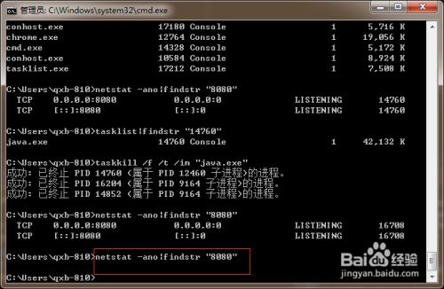 杀掉对应的进程id或者是进程名称之后,然后再通过查找命令,查找对应的端口,现在就可以看到这个端口没有被其他应用所占用,
